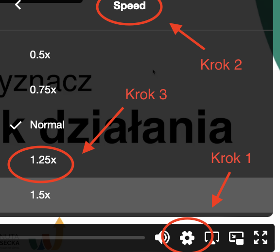 Lekcję możesz obejrzeć w przyspieszeniu. Kliknij w ikonkę koła zębatego na video i wybierz odpowiednią dla siebie szybkość odtwarzania video.