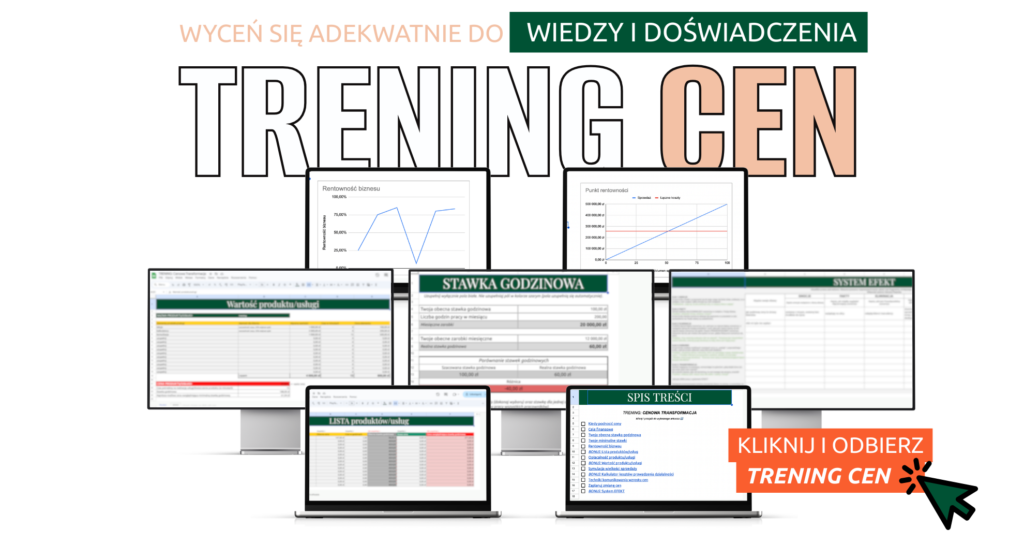 Jeśli temat cen, to coś nad czym czujesz, że czas popracować, to zapraszam Cię do TRENINGU CEN dla właścicielek firm, które czują (i widzą to w swoich finansach), że ich ceny są za niskie i chcą to zmienić.